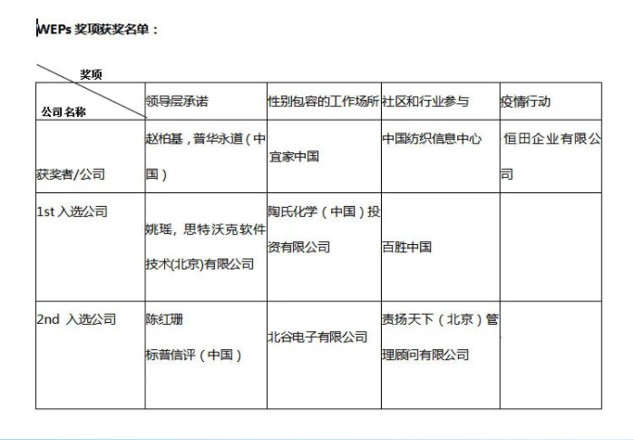 2020年11月18日,由聯(lián)合國婦女署主辦的“2020性別平等與企業(yè)社會責(zé)任國際會議”在北京舉行。會上,聯(lián)合國婦女署首次在中國頒發(fā)了“WEPs(賦權(quán)婦女原則)”中國區(qū)各個獎項: