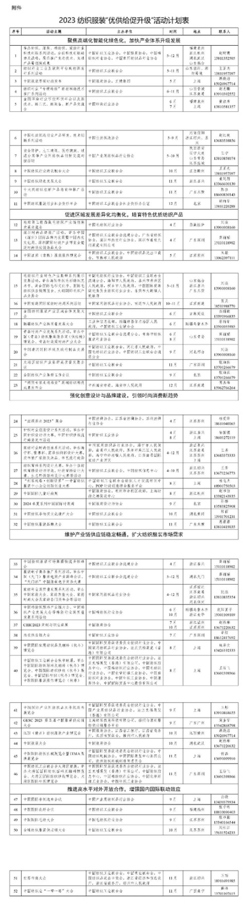 工業(yè)和信息化部辦公廳 商務(wù)部辦公廳關(guān)于開展2023紡織服裝優(yōu)供給促升級活動的通知 工信廳聯(lián)消費(fèi)函〔2023〕87號 各省、自治區(qū)、直轄市及計劃單列市、新疆生產(chǎn)建設(shè)兵團(tuán)工業(yè)和信息化、商務(wù)主管部門,中國紡織工業(yè)聯(lián)合會: 為加快建設(shè)現(xiàn)代化紡織服裝產(chǎn)業(yè)體系,提升紡織服裝供給質(zhì)量,推動紡織服裝行業(yè)穩(wěn)增長、擴(kuò)內(nèi)需、穩(wěn)外需,現(xiàn)組織開展2023紡織服裝優(yōu)供給促升級活動。有關(guān)事項(xiàng)通知如下: 一、總體要求 以習(xí)近平新時代中國特色社會主義思想為指導(dǎo),全面貫徹黨的二十大精神,完整、準(zhǔn)確、全面貫徹新發(fā)展理念,將擴(kuò)大紡織服裝市場需求同深化供給側(cè)結(jié)構(gòu)性改革有機(jī)結(jié)合,深入推動紡織服裝增品種提品質(zhì)創(chuàng)品牌“三品”行動,提振發(fā)展信心,提升產(chǎn)業(yè)韌性,提高供給水平,促進(jìn)產(chǎn)業(yè)升級、產(chǎn)品升級、消費(fèi)升級,推動紡織服裝行業(yè)穩(wěn)中求進(jìn),鞏固紡織服裝優(yōu)勢產(chǎn)業(yè)領(lǐng)先地位。 二、工作任務(wù) (一)聚焦高端化智能化綠色化,加快產(chǎn)業(yè)體系升級發(fā)展。支持企業(yè)加大設(shè)備更新和技術(shù)改造力度,推動企業(yè)數(shù)字化智能化轉(zhuǎn)型,提高企業(yè)節(jié)能減污降碳水平,推進(jìn)廢舊紡織品循環(huán)利用,鞏固提升紡織服裝優(yōu)勢產(chǎn)業(yè)領(lǐng)先地位。組織開展先進(jìn)適用技術(shù)推廣、數(shù)字化轉(zhuǎn)型、科技創(chuàng)新、降本增效、綠色發(fā)展等方面活動,加強(qiáng)企業(yè)間交流合作和典型推廣,幫助企業(yè)抓住新機(jī)遇、開辟新領(lǐng)域、制勝新賽道。 (二)促進(jìn)區(qū)域發(fā)展差異化均衡化,培育特色優(yōu)質(zhì)紡織產(chǎn)品。支持中西部地區(qū)積極承接產(chǎn)業(yè)轉(zhuǎn)移,推動?xùn)|部地區(qū)產(chǎn)業(yè)加快提質(zhì)升級,加強(qiáng)省市內(nèi)及省市間產(chǎn)業(yè)合作,優(yōu)化產(chǎn)業(yè)布局,打造世界級先進(jìn)制造業(yè)集群。發(fā)揮紡織服裝產(chǎn)業(yè)民生就業(yè)優(yōu)勢,積極服務(wù)全面推進(jìn)鄉(xiāng)村振興。組織開展區(qū)域交流合作、特色產(chǎn)品推廣、產(chǎn)業(yè)集群升級、時尚城市建設(shè)、天然纖維應(yīng)用等方面活動,培育特色鮮明、競爭力強(qiáng)的優(yōu)質(zhì)產(chǎn)品。 (三)強(qiáng)化創(chuàng)意設(shè)計與品牌建設(shè),引領(lǐng)時尚消費(fèi)新趨勢。深入實(shí)施增品種提品質(zhì)創(chuàng)品牌“三品”行動,提升紡織服裝創(chuàng)意設(shè)計園區(qū)發(fā)展水平,培育紡織服裝消費(fèi)品牌、制造品牌、區(qū)域品牌,傳承發(fā)揚(yáng)優(yōu)秀中華服裝服飾文化,推動“紡織非遺”與現(xiàn)代時尚融合創(chuàng)新,推動可持續(xù)時尚理念傳播普及。組織開展時裝周、設(shè)計大賽、品牌建設(shè)、流行趨勢發(fā)布、“紡織非遺”推廣等活動,引領(lǐng)時尚趨勢,滿足和創(chuàng)造消費(fèi)需求。 (四)維護(hù)產(chǎn)業(yè)鏈供應(yīng)鏈穩(wěn)定暢通,擴(kuò)大紡織服裝市場需求。發(fā)揮鏈主企業(yè)帶動作用,強(qiáng)化產(chǎn)業(yè)鏈上下游、大中小企業(yè)協(xié)同發(fā)展。加強(qiáng)紡織服裝行業(yè)運(yùn)行監(jiān)測和風(fēng)險管控,保障企業(yè)生產(chǎn)不斷、供應(yīng)穩(wěn)定。推動生產(chǎn)、流通、消費(fèi)高效協(xié)同,暢通紡織服裝線上線下流通渠道。組織開展大中小企業(yè)融通創(chuàng)新“攜手行動”、展覽展示等活動,辦好“棉紡消費(fèi)季”等消費(fèi)促進(jìn)活動,促進(jìn)產(chǎn)業(yè)鏈供應(yīng)鏈交流合作和循環(huán)暢通,恢復(fù)和擴(kuò)大紡織服裝市場需求。 (五)推進(jìn)高水平對外開放合作,增強(qiáng)國內(nèi)國際聯(lián)動效應(yīng)。依托我國紡織服裝產(chǎn)業(yè)鏈供應(yīng)鏈完整優(yōu)勢,支持企業(yè)深度參與全球分工和合作,用好國內(nèi)國際兩個市場兩種資源,與其他國家和地區(qū)形成高效協(xié)同產(chǎn)業(yè)體系。加快培育出口競爭新優(yōu)勢,提升國際資源整合能力,搭建內(nèi)外貿(mào)一體化市場網(wǎng)絡(luò)。組織開展紡織行業(yè)國際經(jīng)貿(mào)合作、國際供應(yīng)鏈對接等活動,提升紡織行業(yè)貿(mào)易投資合作質(zhì)量和水平,培育國際經(jīng)貿(mào)合作新增長點(diǎn)。 三、工作要求 (一)加強(qiáng)組織協(xié)調(diào)。中國紡織工業(yè)聯(lián)合會按照《2023紡織服裝“優(yōu)供給促升級”活動計劃表》(見附件)安排,精心策劃方案,抓好任務(wù)落實(shí)。各地工業(yè)和信息化主管部門、商務(wù)主管部門結(jié)合本地實(shí)際和發(fā)展需要,組織開展本地區(qū)“優(yōu)供給促升級”等方面活動,并與有關(guān)行業(yè)協(xié)會和地方加強(qiáng)對接,形成合力統(tǒng)籌推動“優(yōu)供給促升級”活動務(wù)實(shí)見效。 (二)抓好宣傳報道。各單位要重視輿論宣傳工作,整合媒體資源,豐富宣傳形式,綜合運(yùn)用紙媒、網(wǎng)站、公眾號、短視頻平臺、直播平臺等手段,打造立體生動傳播方式,對活動進(jìn)行多渠道、全方位報道,宣傳推廣紡織服裝好品牌、好技術(s