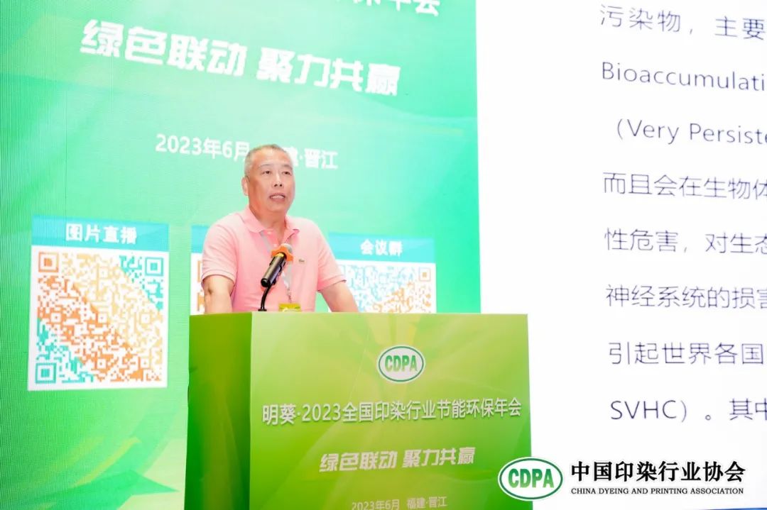上海天祥質(zhì)量技術(shù)服務(wù)有限公司顧問(wèn)王建平作“《重點(diǎn)管控新污染物清單(2023年版)》對(duì)印染行業(yè)的影響及其應(yīng)對(duì)”專題報(bào)告。王建平介紹了重點(diǎn)管控新污染物的定義、《重點(diǎn)管控新污染物清單(2023年版)》發(fā)布的目的和意義,重點(diǎn)講解了《清單》涉及的14類物質(zhì)及管控方式,同時(shí)詳細(xì)分析了PFOS類/PFOA類、PFHxS類、十溴二苯醚、短鏈氯化石蠟、壬基酚等物質(zhì)對(duì)印染行業(yè)的影響及其應(yīng)對(duì)方法。