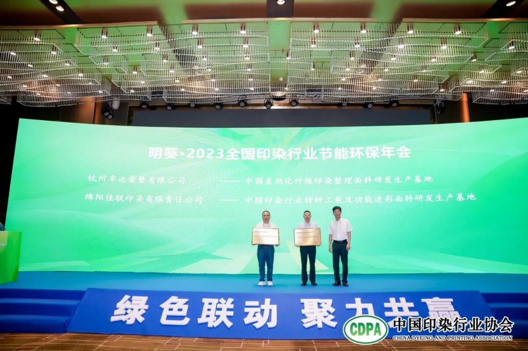 同時(shí),林琳還宣讀了《關(guān)于批準(zhǔn)杭州卓達(dá)染整有限公司等單位繼續(xù)作為中國(guó)印染行業(yè)協(xié)會(huì)產(chǎn)品研發(fā)生產(chǎn)基地的決定》,經(jīng)有關(guān)公司申請(qǐng)、協(xié)會(huì)研究決定,同意杭州卓達(dá)染整有限公司繼續(xù)作為“中國(guó)差別化纖維印染整理面料研發(fā)生產(chǎn)基地”,綿陽(yáng)佳聯(lián)印染有限責(zé)任公司繼續(xù)作為“中國(guó)印染行業(yè)特種工裝及功能迷彩面料研發(fā)生產(chǎn)基地”,并進(jìn)行了授牌。