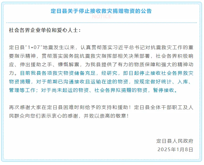 據不完全統計,截至8日17時,相關大額捐贈(含物資)超2.3億元,定日縣即日起停止接收社會各界救災物資捐贈。