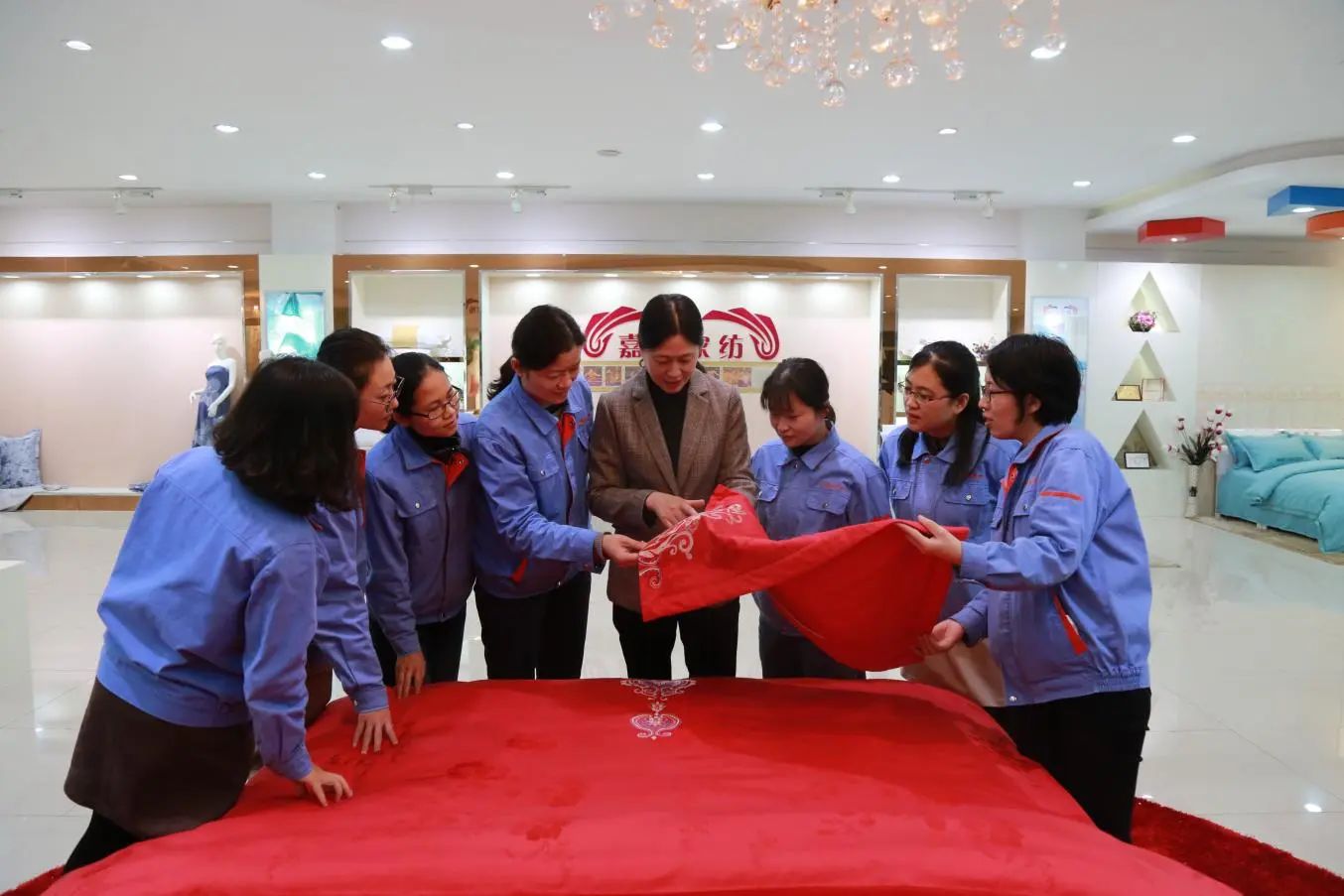 山東魏橋嘉嘉家紡有限公司董事長(zhǎng)宋海英在展廳內(nèi),與員工一同研討新款床品細(xì)節(jié)。 山東魏橋嘉嘉家紡有限公司現(xiàn)有職工537人,其中女性職工483人,是地地道道“娘子軍”集體。廣大女工弘揚(yáng)“四自”精神,團(tuán)結(jié)奮進(jìn),愛(ài)崗敬業(yè),為企業(yè)高質(zhì)量發(fā)展做出了突出貢獻(xiàn)。 黨建引領(lǐng),弘揚(yáng)巾幗之志。魏橋嘉嘉堅(jiān)持以黨建帶婦建,以婦建促黨建,依托支部25名女性黨員先后建立“黨員先鋒崗”17個(gè),劃分“黨員責(zé)任區(qū)”19個(gè),設(shè)置“巾幗示范崗”25個(gè)。以組織共建、陣地共用、資源共享、活動(dòng)共辦、服務(wù)共融持續(xù)推進(jìn)思想同心、目標(biāo)同向、工作同步,使黨組織的政治核心和婦聯(lián)組織聯(lián)系服務(wù)婦女群眾的橋梁紐帶作用得到充分發(fā)揮。
