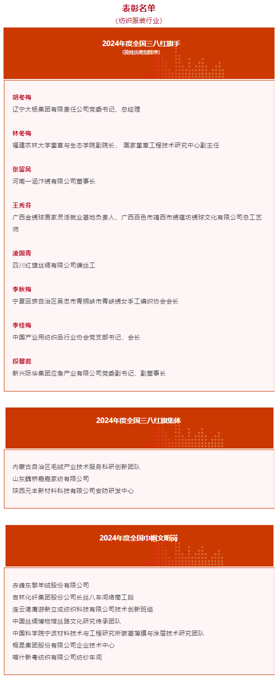 3月6日,全國(guó)三八紅旗手(集體)、全國(guó)巾幗文明崗,中央和國(guó)家機(jī)關(guān)三八紅旗手(集體)表彰會(huì)在京舉行。中國(guó)產(chǎn)業(yè)用紡織品行業(yè)協(xié)會(huì)會(huì)長(zhǎng)李桂梅參會(huì)并受到“全國(guó)三八紅旗手”表彰。 今年全國(guó)婦聯(lián)組織開(kāi)展的2024年度全國(guó)三八紅旗手標(biāo)兵、全國(guó)三八紅旗手、全國(guó)三八紅旗集體、全國(guó)巾幗文明崗評(píng)選表彰中,共有10名全國(guó)三八紅旗手標(biāo)兵、596名全國(guó)三八紅旗手、395個(gè)全國(guó)三八紅旗集體、599個(gè)全國(guó)巾幗文明崗獲表彰。 這些優(yōu)秀個(gè)人和集體中不乏紡織人身影,其中,李桂梅、胡冬梅等8人榮獲“全國(guó)三八紅旗手”稱號(hào),山東魏橋嘉嘉家紡有限公司等榮獲“全國(guó)三八紅旗集體”稱號(hào),吉林化纖集團(tuán)股份公司長(zhǎng)絲八車(chē)間絡(luò)筒工段、連云港鷹游新立成紡織科技有限公司技術(shù)創(chuàng)新班組等榮獲“全國(guó)巾幗文明崗”稱號(hào)。 《紡織服裝周刊》特梳理出這些被授予榮譽(yù)稱號(hào)的紡織人和集體,并將她們的先進(jìn)事跡呈現(xiàn)給大家。