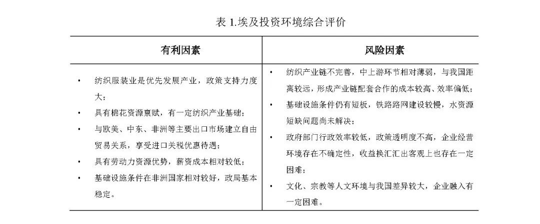 (2)埃及具有棉花資源稟賦,有一定產業基礎和一定數量的熟練工人,有配套條件比較成熟的工業園區可供企業直接入駐,產業集聚效應明顯。埃及政府出臺了紡織業發展遠景規劃,以較大力度的優惠政策吸引、鼓勵海外投資。