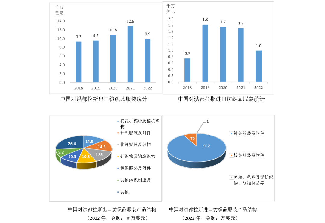 2023年,洪都拉斯和中國正式建立外交關(guān)系,成為中國第182個(gè)建交國。此前雖無外交關(guān)系,但兩國紡織行業(yè)仍有貿(mào)易往來。據(jù)中國海關(guān)統(tǒng)計(jì),2022年中國與洪都拉斯紡織品服裝進(jìn)出口總額為1.1億美元,其中出口額9883萬美元,進(jìn)口額992萬美元。中國對(duì)洪都拉斯主要出口產(chǎn)品包括棉紗及棉機(jī)織物(占比14.6%)、針織服裝及附件(占比14.4%)、化纖短纖及織物(占比14%)、針織物及鉤編織物(占比10.6%)、梭織服裝及附件(占比10.4%)等;進(jìn)口產(chǎn)品僅有針織服裝及附件(912萬美元,占比91.9%),梭織服裝及附件(79萬美元,占比8%),絮胎、氈呢及無紡織物、線繩制品等(1萬美元)。