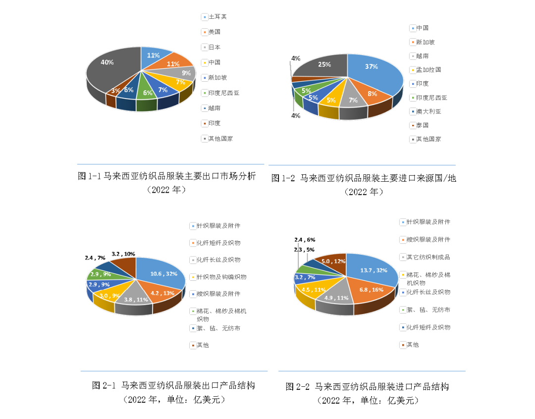馬來西亞統計局數據顯示,2022年馬來西亞紡織品服裝出口總額為33億美元,其中,紡織品出口19.5億美元,服裝出口13.5億美元,主要銷往土耳其、美國、日本、中國、新加坡、印度尼西亞等國家,主要出口產品包括針織服裝及附件(占比32%)、化纖短纖(占比13%)、化纖長絲(占比11%)、針織物(9%)等。同期,馬來西亞紡織品服裝進口額為42.9億美元,其中紡織品進口22.4億美元,服裝進口20.5億美元。中國是馬來西亞第一大紡織品服裝進口來源地,占馬來西亞紡織品服裝進口總額的36.8%,其次是新加坡、越南、孟加拉國、印度等國家。主要進口產品包括針織服裝及附件(占比32%),梭織服裝及附件(占比16%),棉花、棉紗及棉機織物(占比11%)等。