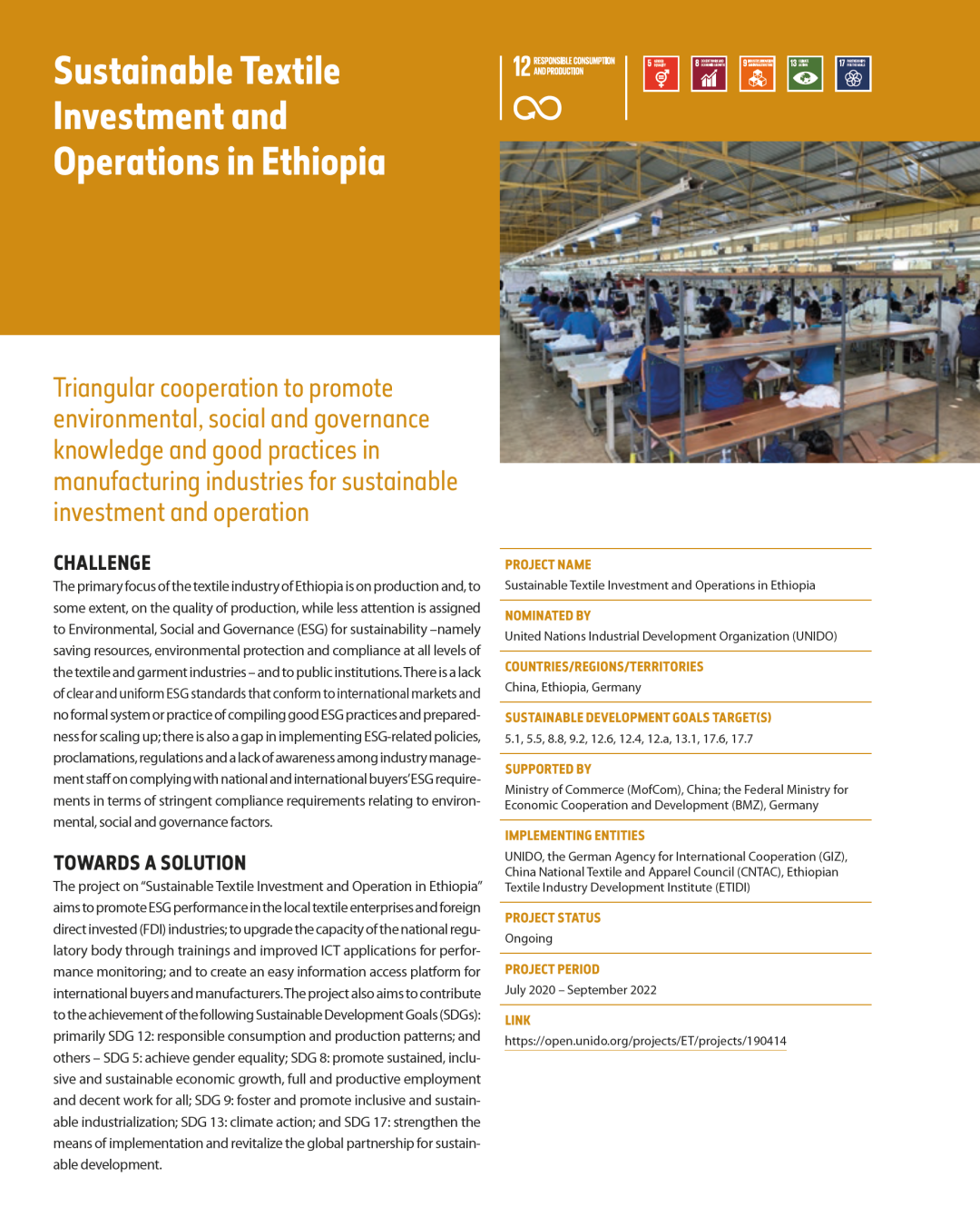 埃塞項目是在中國、德國和埃塞俄比亞三國關(guān)于“埃塞俄比亞可持續(xù)紡織業(yè)投資與運營”三方合作框架下,由中國紡織工業(yè)聯(lián)合會(CNTAC)、聯(lián)合國工業(yè)發(fā)展組織(UNIDO)、德國國際合作機(jī)構(gòu)(GIZ)和埃塞俄比亞制造業(yè)發(fā)展研究院(EMIDI)合作執(zhí)行,旨在提高埃塞俄比亞紡織服裝企業(yè)的環(huán)境、社會和治理(ESG)績效,并提升行業(yè)的可持續(xù)發(fā)展能力。具體分為基線調(diào)研、能力建設(shè)和經(jīng)驗推廣三大階段。 自2020年9月起,中國紡聯(lián)社會責(zé)任辦公室聯(lián)合EMIDI和UNIDO,組建聯(lián)合團(tuán)隊開展調(diào)研工作。調(diào)研對象覆蓋15家在埃塞俄比亞運營的中資紡織服裝企業(yè)、15家埃塞俄比亞當(dāng)?shù)仄髽I(yè)與其他非中資的外資紡織服裝企業(yè)、國際品牌企業(yè),以及埃塞工業(yè)園區(qū)發(fā)展公司(IPDC)、埃塞投資委員會(EIC)及重要非政府組織等利益相關(guān)方,以多方合作的伙伴關(guān)系視角,深入探究在埃塞俄比亞運營的紡織服裝企業(yè)的環(huán)境、社會和治理(ESG)現(xiàn)狀,以及“新冠”疫情對當(dāng)?shù)禺a(chǎn)業(yè)的影響。