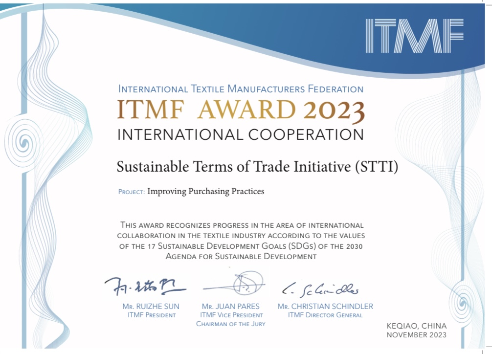| 可持續(xù)貿(mào)易條款倡議項(xiàng)目“可持續(xù)貿(mào)易條款倡議”榮獲國際紡聯(lián)2023年度國際合作獎(jiǎng) |