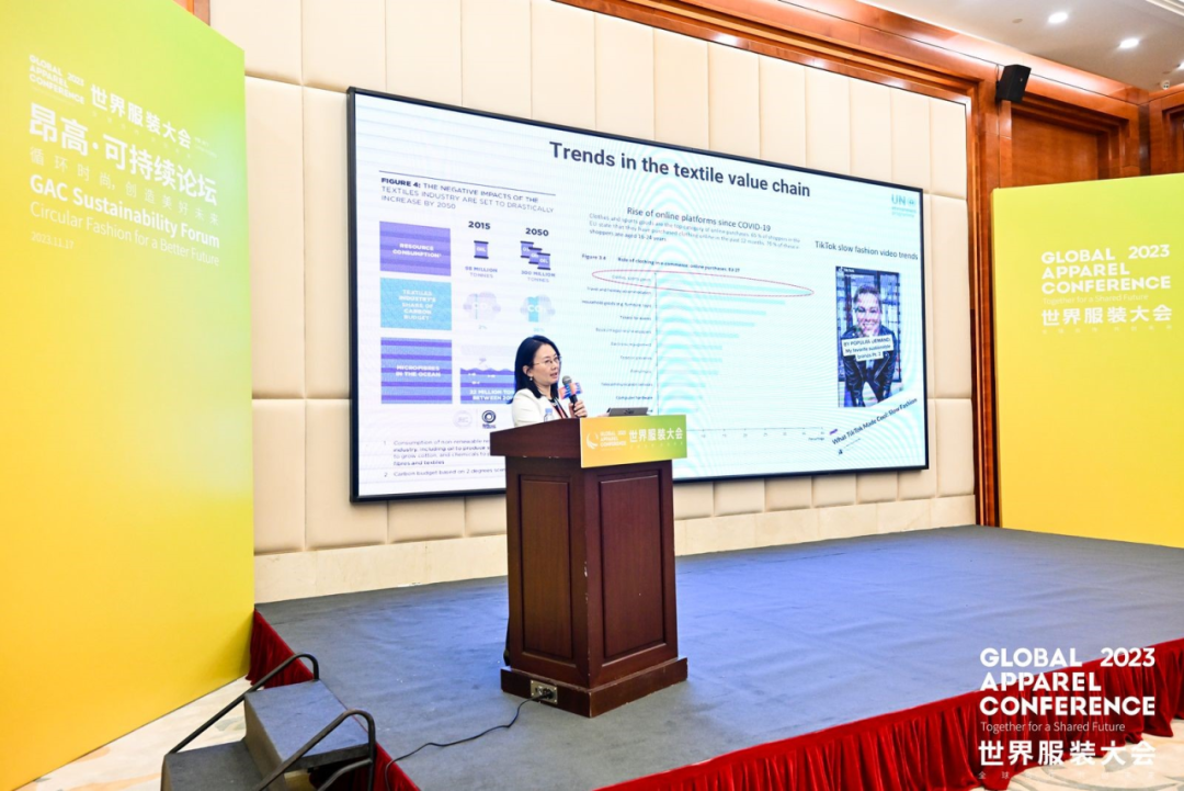聯(lián)合國(guó)環(huán)境規(guī)劃署駐華代表處項(xiàng)目規(guī)劃主任王茜在《紡織價(jià)值鏈的可持續(xù)性和循環(huán)性--全球路線圖》的分享中表示,紡織服裝產(chǎn)業(yè)的消費(fèi)群體、消費(fèi)市場(chǎng)、銷售模式都在發(fā)生變化,為應(yīng)對(duì)這些變化、推動(dòng)全球可持續(xù)性和循環(huán)性發(fā)展,聯(lián)合國(guó)環(huán)境署推出了全球路線圖的三大目標(biāo),一是擴(kuò)展循環(huán)商業(yè)模式,從中獲取更多的行業(yè)收入;二是促進(jìn)可循環(huán)消費(fèi),消除鼓勵(lì)過(guò)度消費(fèi)的信息;三是在整個(gè)價(jià)值鏈當(dāng)中降低整體化學(xué)品的使用。此外,聯(lián)合國(guó)還甄別出了四大關(guān)鍵利益相關(guān)方和九個(gè)基礎(chǔ)的板塊。她強(qiáng)調(diào),實(shí)現(xiàn)循環(huán)經(jīng)濟(jì)需要相關(guān)方通力合作,從設(shè)計(jì)做起,共同推動(dòng)行業(yè)綠色轉(zhuǎn)型。