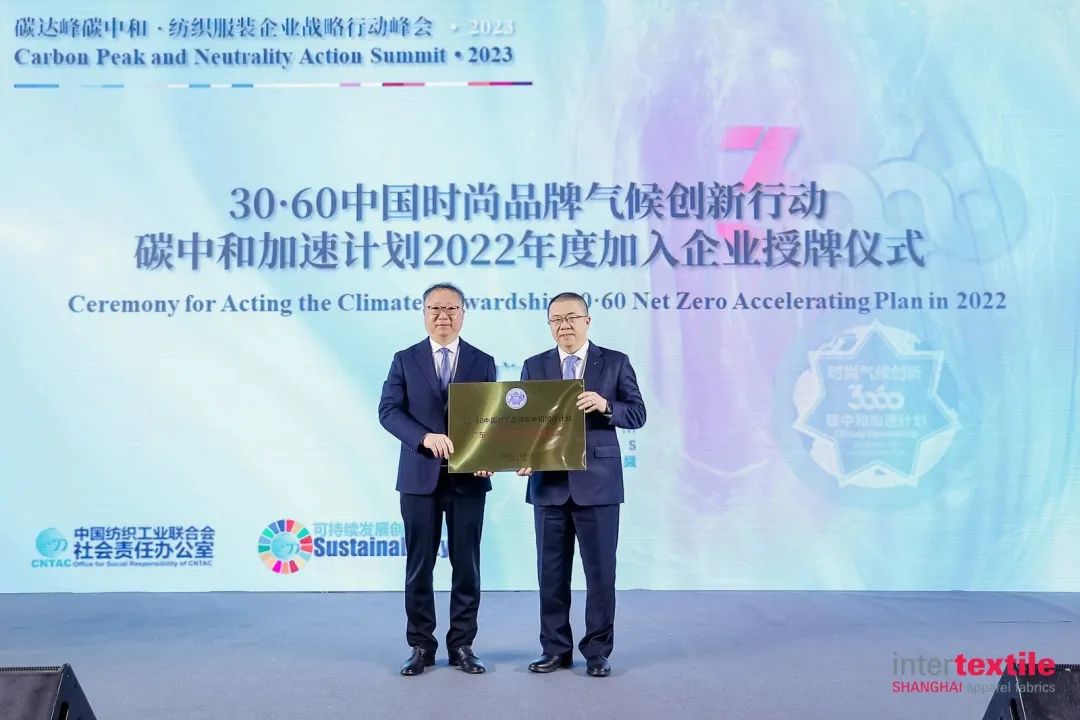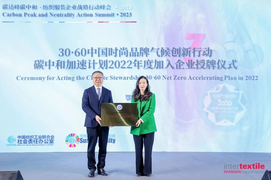 會上舉行了30·60中國時尚品牌氣候創新行動碳中和加速計劃2022年度加入企業授牌儀式。孫瑞哲為鄂爾多斯、卡賓服飾、達利中國、廣東兆天的企業代表頒發牌匾。