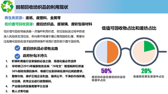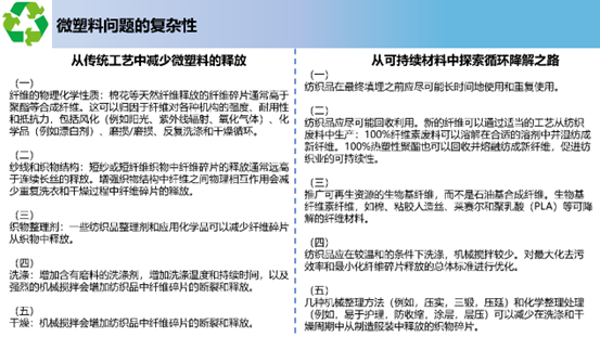 關曉宇博士首先介紹了“循環經濟”的概念,回收紡織品的利用現狀,以及當前面臨的微塑料問題的復雜性。關博士指出,如果可以將當前的“線性經濟”轉變成“循環經濟”,將目前數量龐大的廢舊紡織服裝利用起來,將是對于“循環經濟”而言,非常大的貢獻。同時,通過不同的形式,比如建立階梯化的利用,對廢舊紡織品高值化的開發和應用,以及呼吁政府進行一定的增值稅減免以鼓勵企業進行廢舊紡織品回收和開發,將是紡織材料行業未來的出路。在應對微塑料問題方面,關博士提出,新材料的誕生,并不能完全解決已出現的微塑料問題,比如生物基塑料在分解時,會減少土壤中的營養成分。