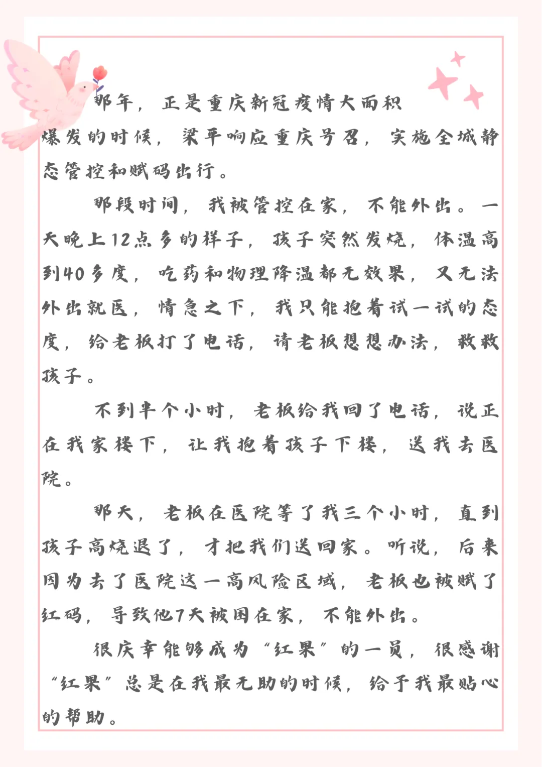 員工徐敏來自四川大竹縣,是2位孩子的母親。進入紅果工作后,工廠不但幫助她解決了孩子們的就學(xué)問題,還在疫情最嚴峻時期排除萬難,廠長親自護送她與持續(xù)高燒的孩子到醫(yī)院,讓孩子及時獲得了治療。