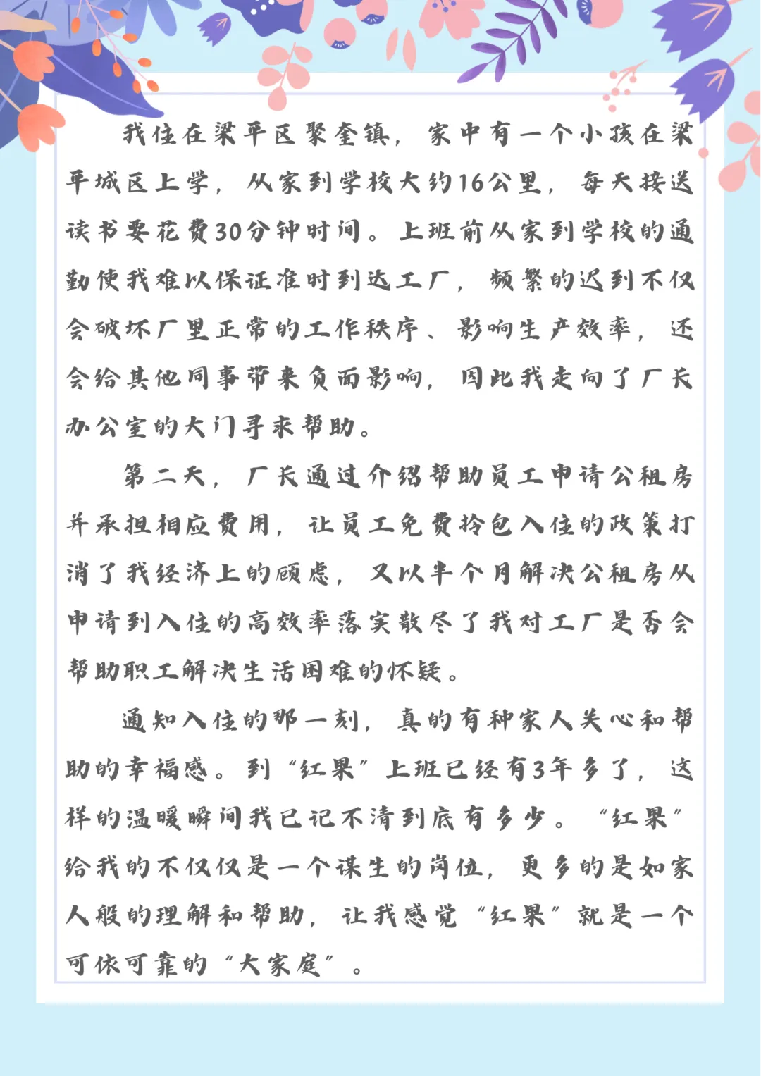 員工對工廠的信任來源于紅果對員工的關(guān)愛,也讓所有紅果員工切身感受到工廠關(guān)懷。