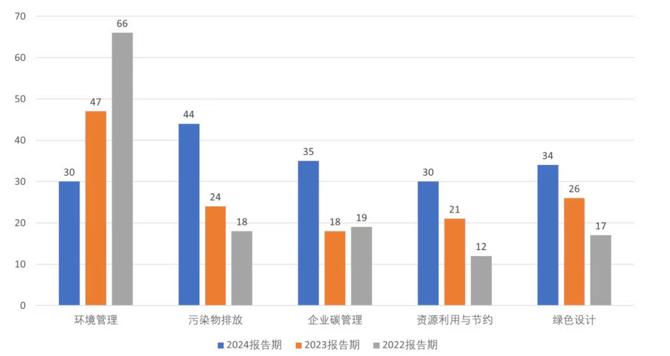 環境評估中,分布結構呈現出典型的“金字塔”形態,行業內部分化與梯隊差距顯著。較于2023報告期,行業整體在環境維度的評估提升較大,頭部企業率先加大了在環境方面的投入與披露;然而,行業平均分仍處于較低水平,且CCC級企業數量龐大。