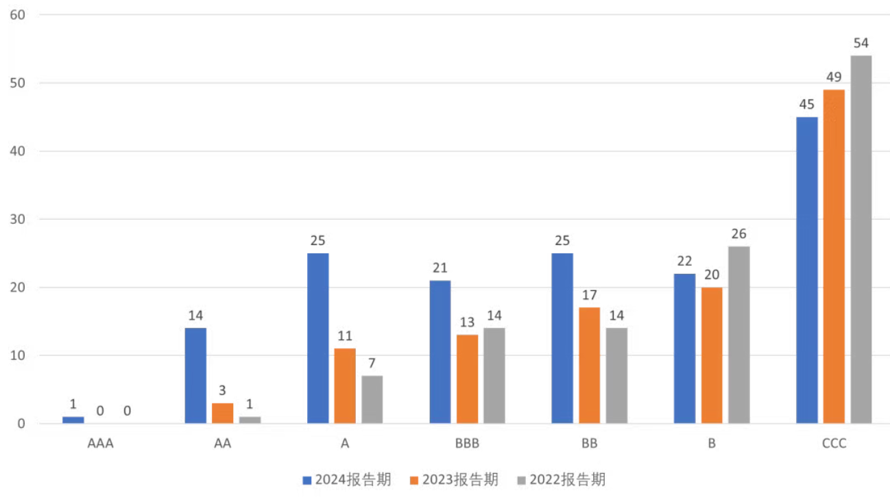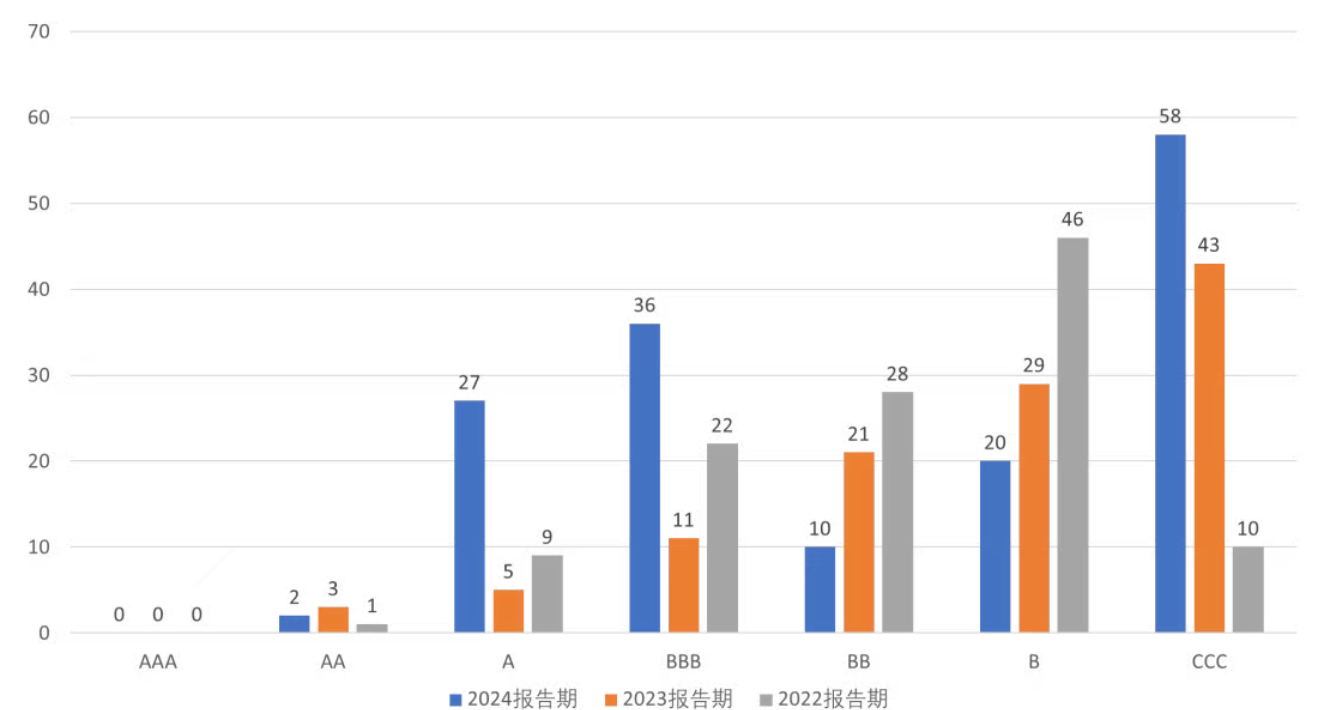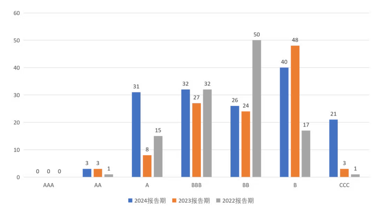 社會評估中上市企業信息披露差異性較高。相較于2023報告期,行業整體績效水平有較大的提升。雖然達到AA級的企業數量有所減少,但評估為A級的企業數量增加了440%,其余高評估區間的企業占比都有所上升。