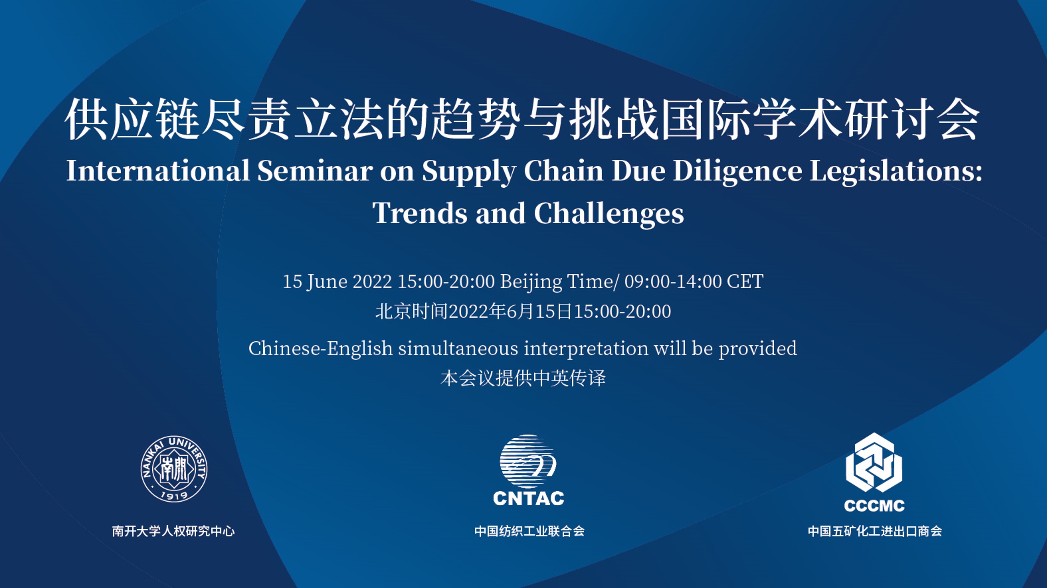 2022年6月15日,由南開大學人權研究中心主辦,中國紡織工業(yè)聯(lián)合會和中國五礦化工進出口商會合辦的“供應鏈盡責立法的趨勢與挑戰(zhàn)國際學術研討會”通過在線平臺順利舉行,超過一千八百人次實時觀看了此次研討會。