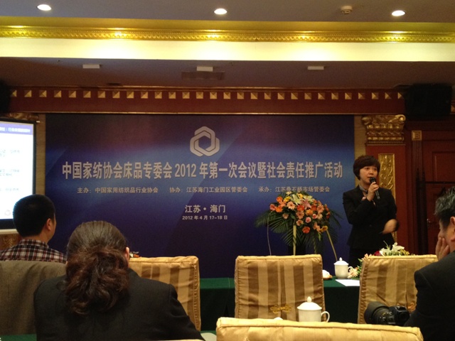 中國家紡協(xié)會(huì)床上用品專業(yè)委員會(huì)2012年第一次會(huì)議于4月17-18日在江蘇海門光華國際大酒店隆重召開。作為會(huì)議重要內(nèi)容之一,18日下午特別舉辦了家紡企業(yè)社會(huì)責(zé)任培訓(xùn)講座,有近60名全國家紡行業(yè)企業(yè)負(fù)責(zé)人參加